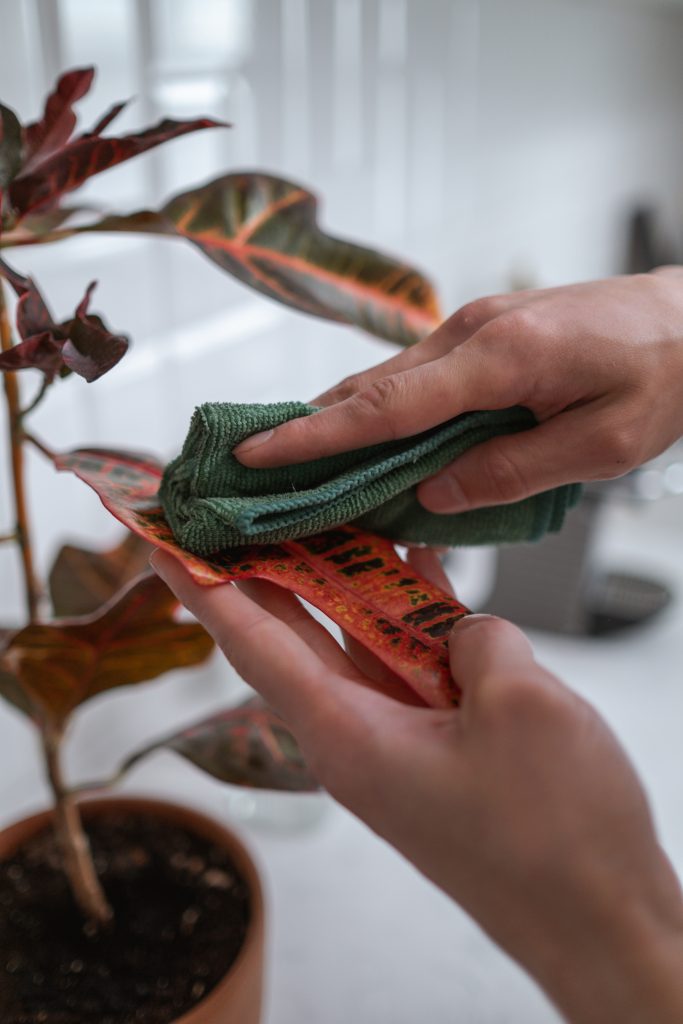 Cel puțin o dată pe săptămână, este necesar să curățați frunzele, în special cele mai mari, cum ar fi cele de cale, pasarea paradisului și ficus.Spalati plantele o dată pe lună cu apă călduță și apoi ștergeti frunzele cu o cârpă moale. Dacă aveți apă foarte dura, atunci este bine să ștergeți frunzele cu o cârpă ușor umedă, pe care o înmuiați în apă cu câteva picături de oțet adăugate înainte de ștergere. Pe scurt, pe lângă faptul că nu dorim frunze prăfuite, nici nu vrem ca frunzele să fie pline de pete albe ca urmare a apei dure.
