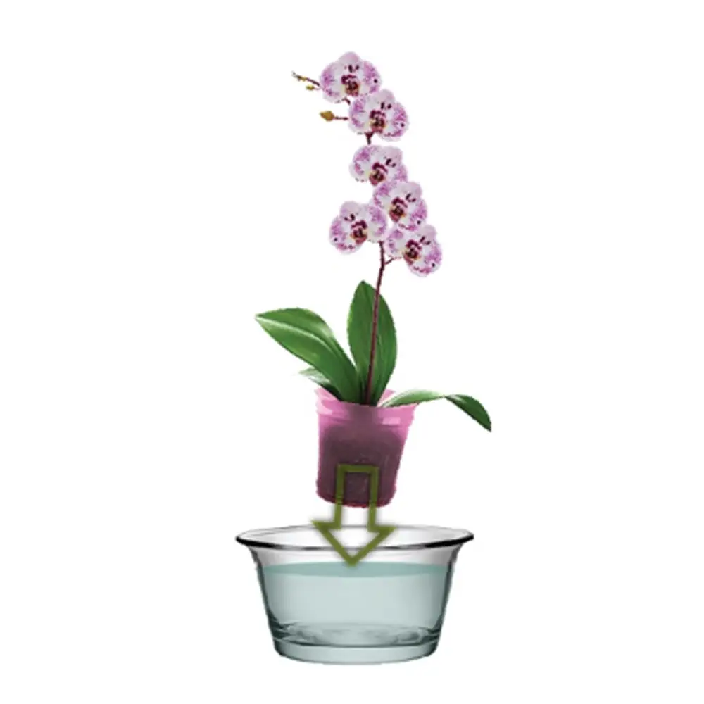 Folosiți ghivece ornamentale care sunt puțin mai înalte decât ghiveciul de plastic în care crește orhideea, deoarece permit scurgerea excesului de apă.